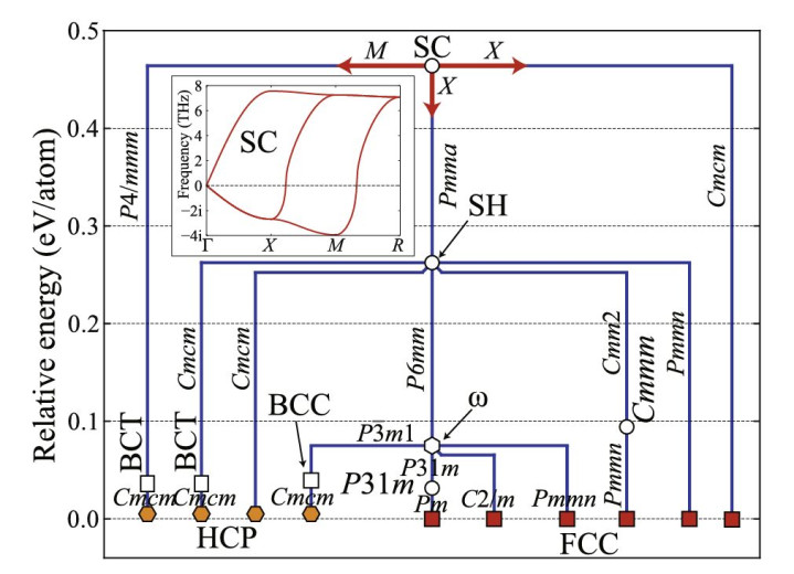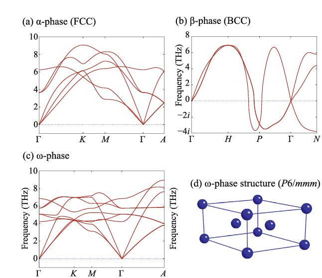 在钛金属中,不同相的声子计算揭示了BCC相在低温下不稳定(存在虚频),只有在高温才通过振动振幅扭曲到稳定结构,这解释了实验中1100K以上才出现α→β相变的现象。